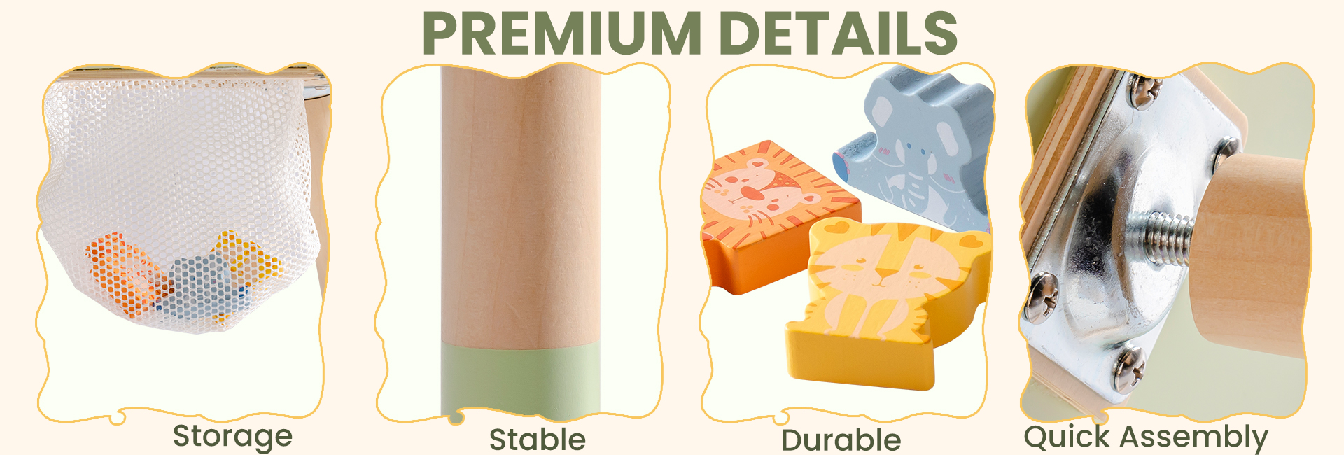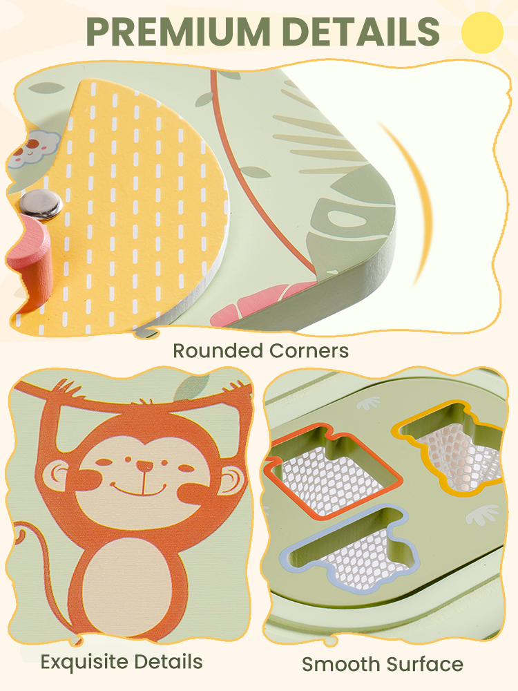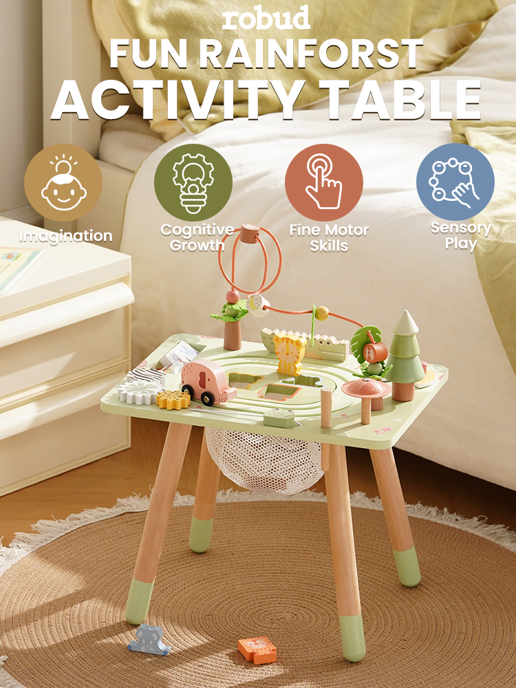 Montessori Design: This activity table, suitable for toddlers aged 1-3, encourages hands-on learning and interactive play. Activities like shape sorting and Rainforest Beads improve fine motor skills and hand-eye coordination, fostering problem-solving and cognitive development.