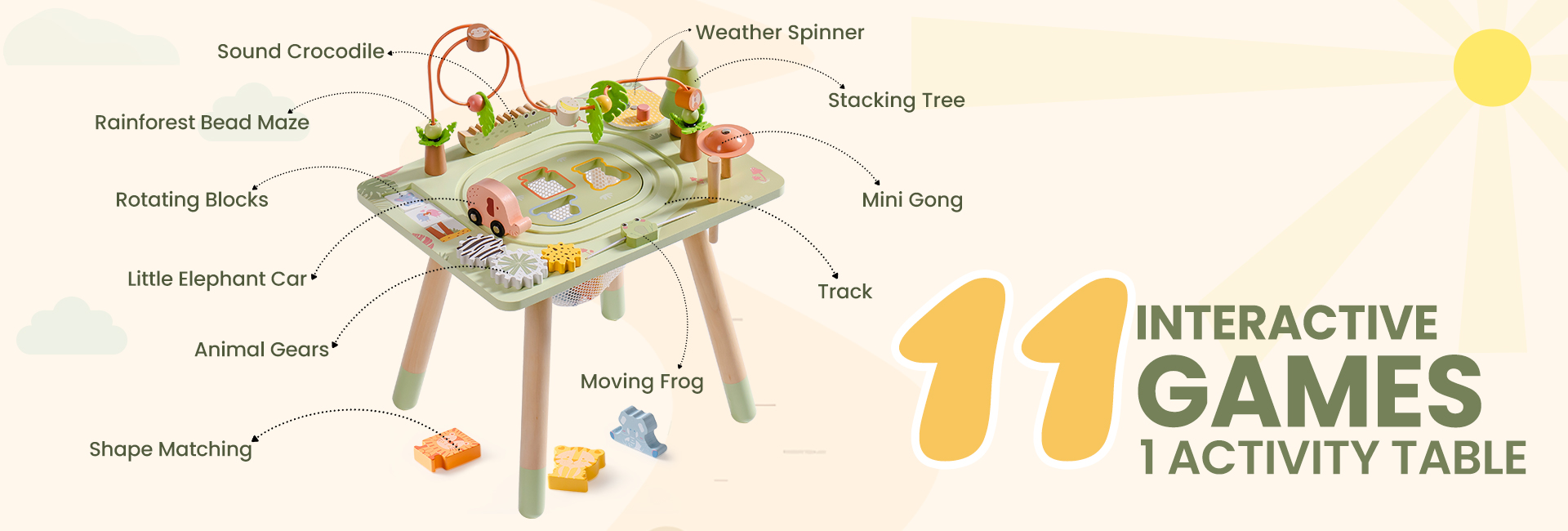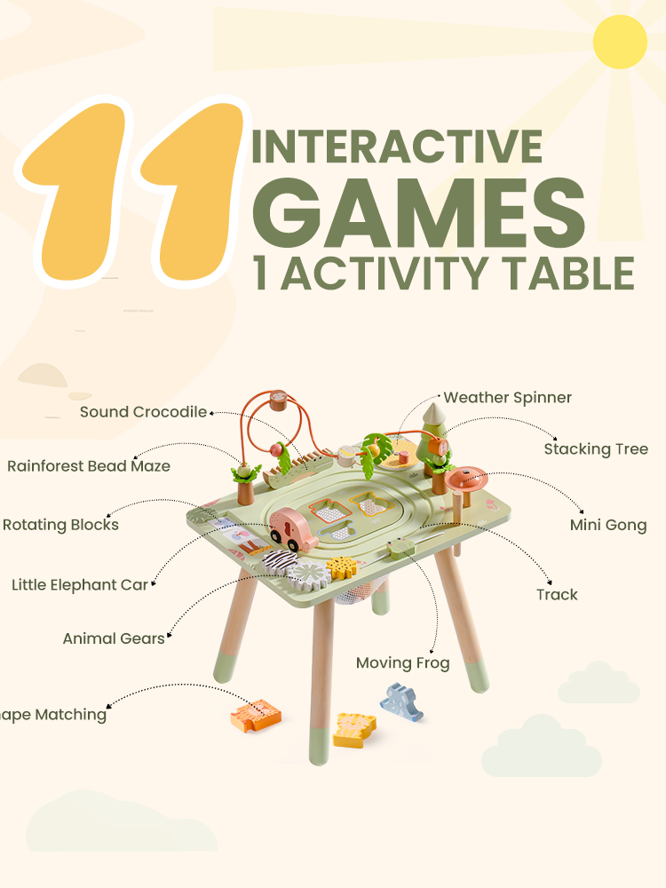 11-in-1 Activity Table: This learning table offers 11 activities: Animal Gears, Mobile Hopping Frog, Little Gong, Stacking Tree, Weather Spinner, Sounding Crocodile, Tumble Blocks, Baby Elephant Cart, Track, Shape Matching, and Rainforest Beads. It's perfect for developing fine motor skills, cognitive development, and creativity, providing a hands-on, fun learning experience that encourages exploration and development through play.