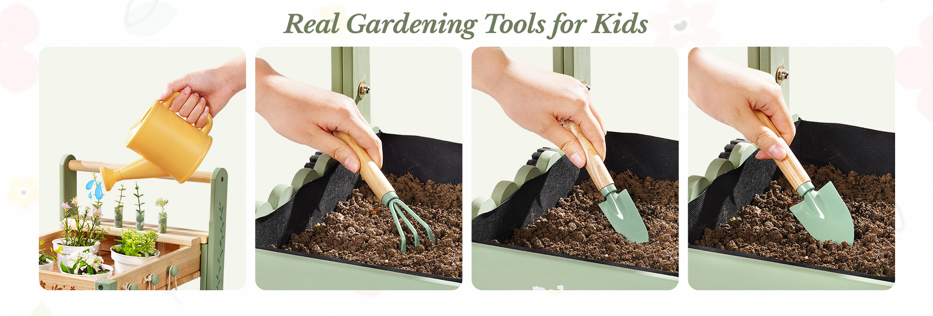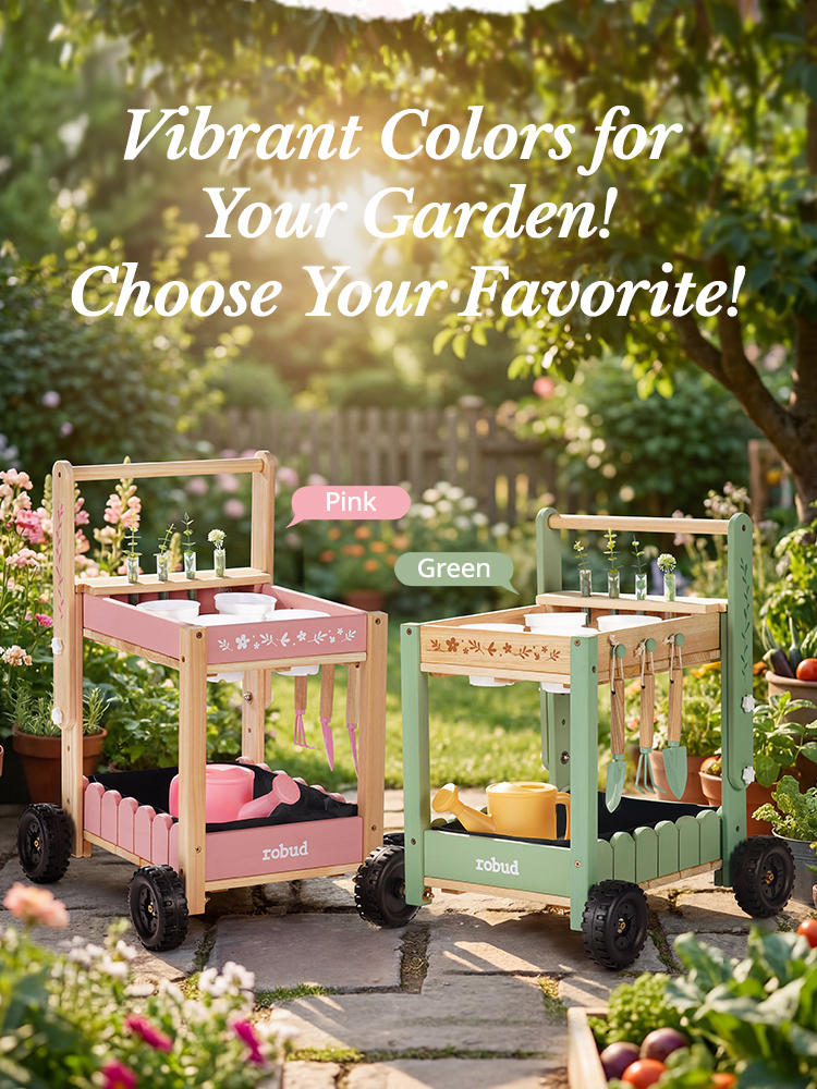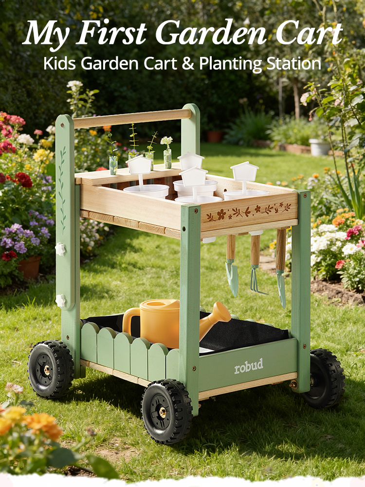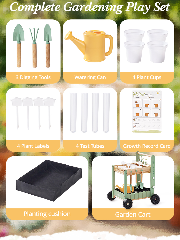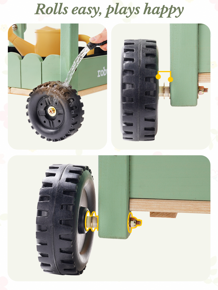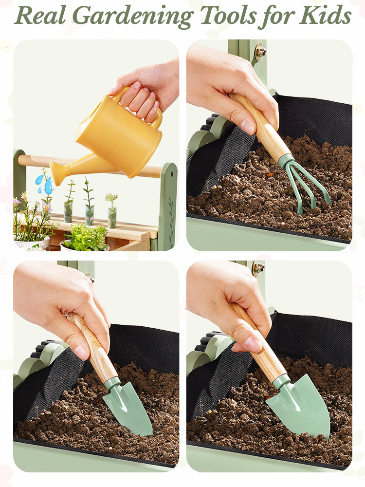 🚜 Mobile Garden Cart Design, Stable & Easy to Maneuver – Unlike ordinary kids gardening tools, this set features a sturdy cart. The cart’s four sturdy wheels provide stability on uneven surfaces, making it easy for kids to push around the garden. Kids move their tools and plants effortlessly, turning every garden corner into a fun planting spot.