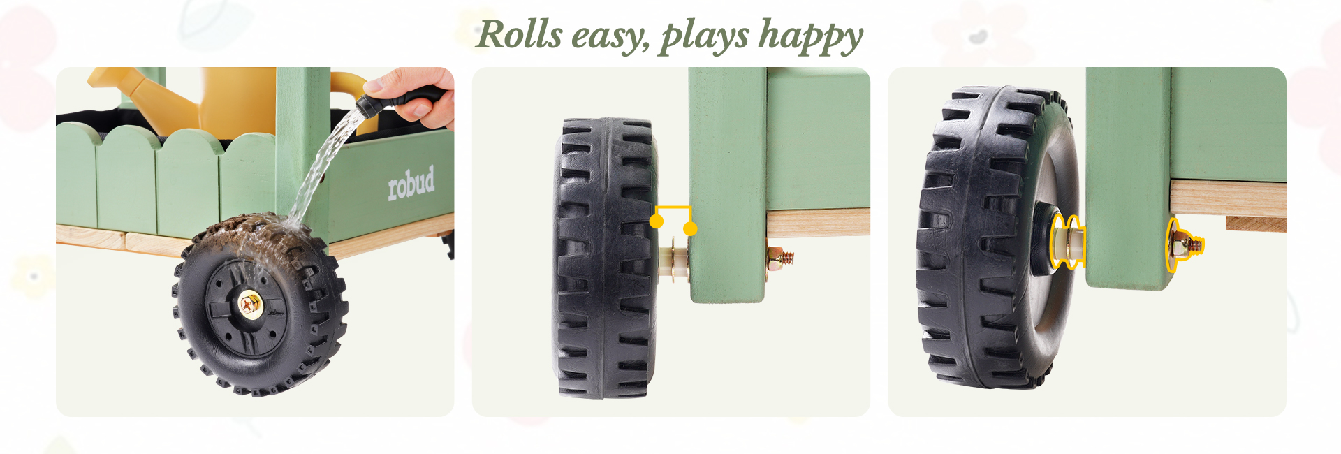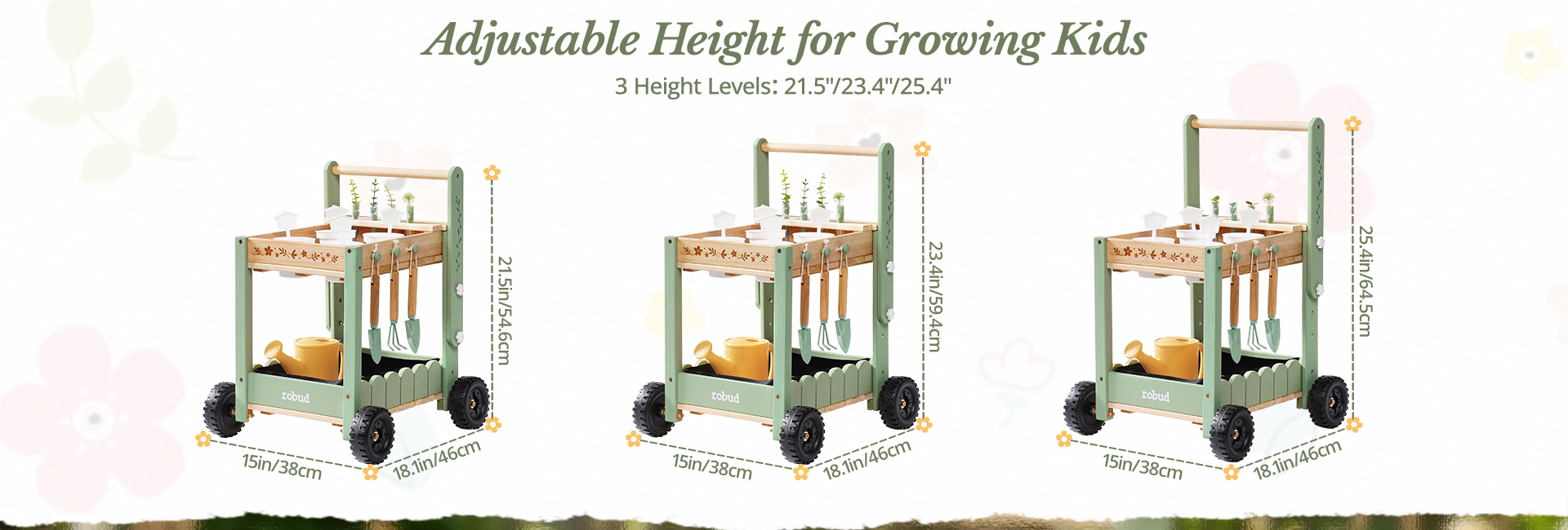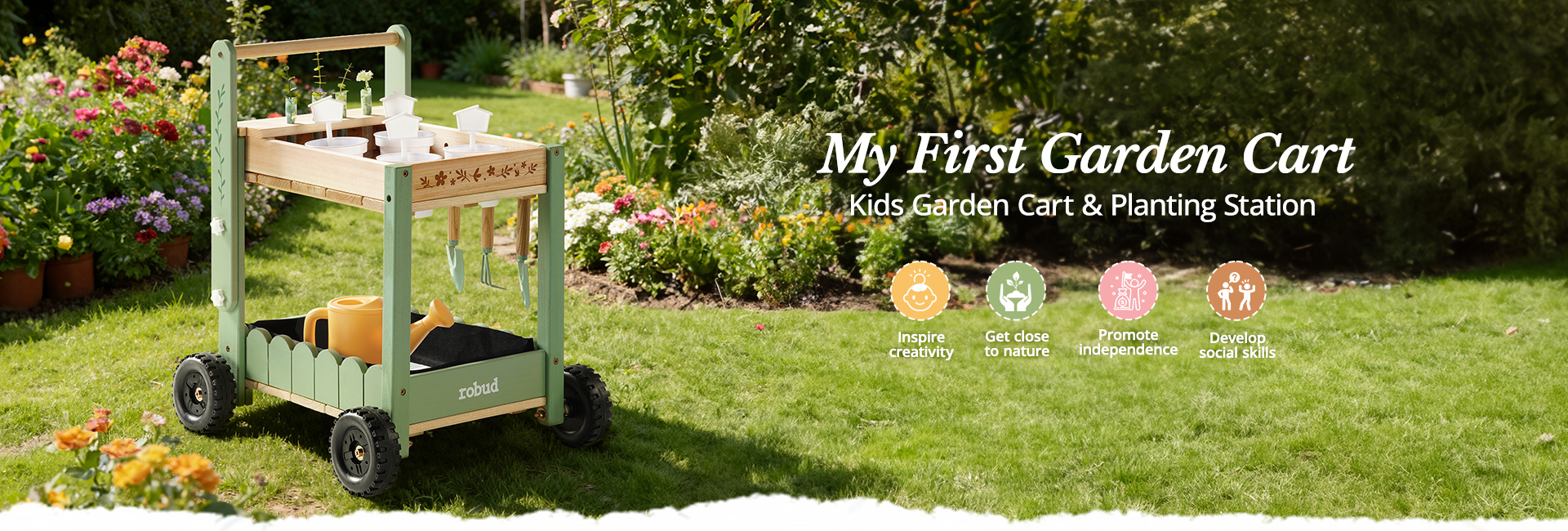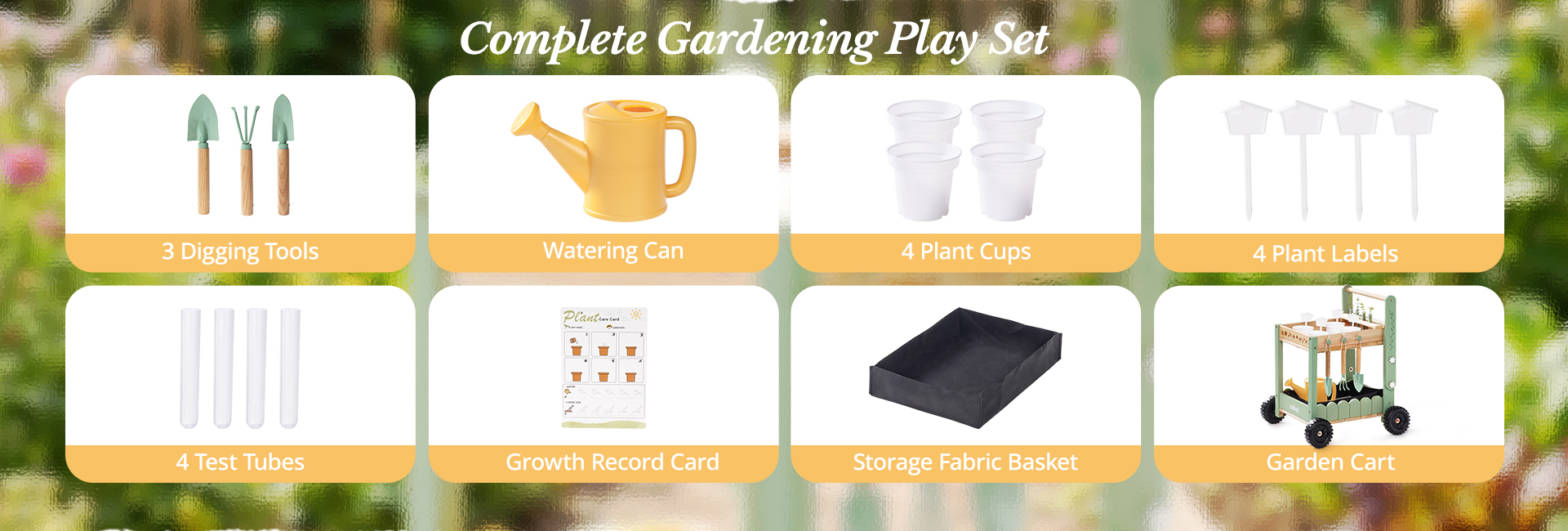 🚜 Mobile Garden Cart Design, Stable & Easy to Maneuver – Unlike ordinary kids gardening tools, this set features a sturdy cart. The cart’s four sturdy wheels provide stability on uneven surfaces, making it easy for kids to push around the garden. Kids move their tools and plants effortlessly, turning every garden corner into a fun planting spot.