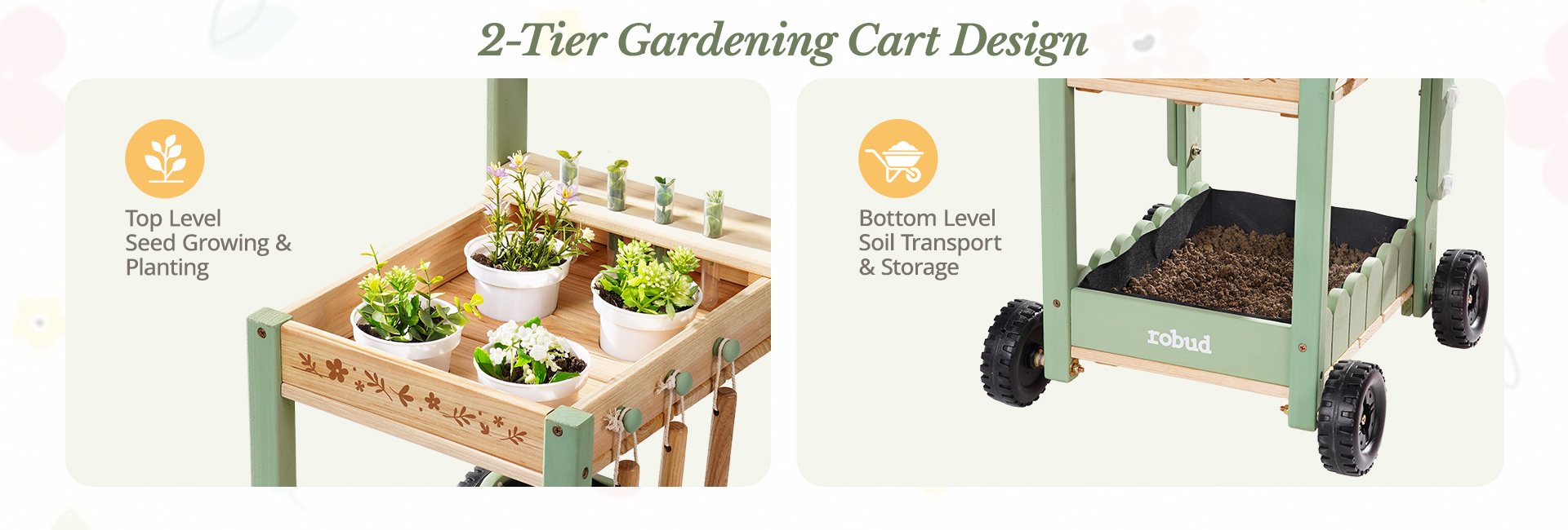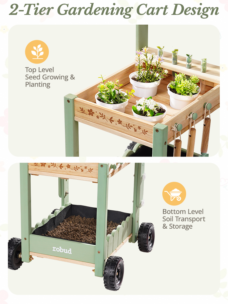 🧺 Tidy Play With Smart Storage – The top shelf keeps planting cups and hydroponic tubes organized, while the bottom compartment holds tools and accessories. No more lost toys in the grass—teach kids to keep their garden kit neat as they play.