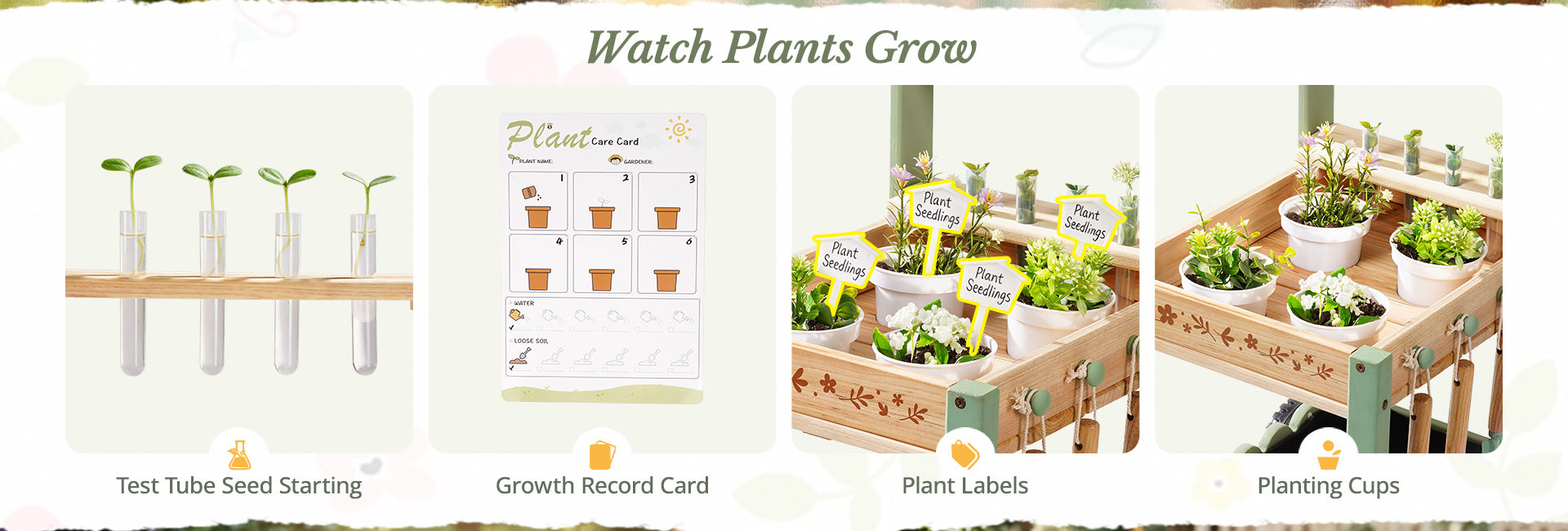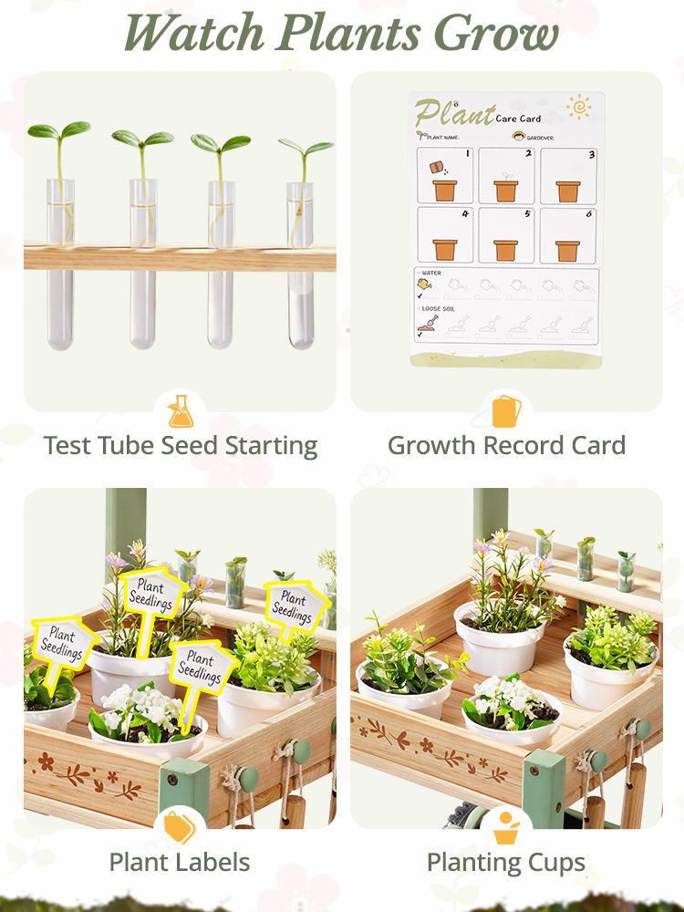 🌱 Grow & Discover with Dual Planting Ways – This kids gardening set comes with garden trolley, 4 soil planting pots and 4 clear hydroponic tubes. Start seeds in hydroponic tubes, move growing plants into pots, then transplant into the soil until the harvest. Let children observe and experience the entire process of plant growth in a real-life way, it sparking their curiosity about how plants grow.