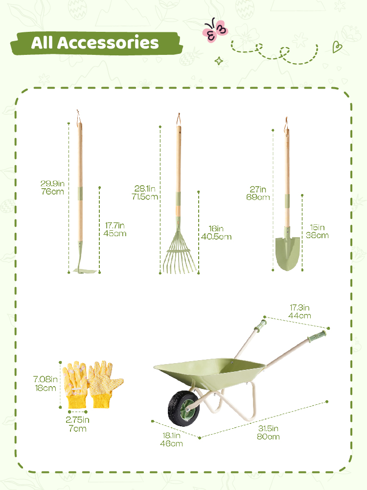 - Durable, Kid-Friendly Materials--Made of strong, smooth plastic with no sharp edges, this kids wheelbarrow set is built to last through every season. Easy to clean and weather-resistant, it’s a great outdoor toy for garden play, backyard fun, or even sandbox adventures.