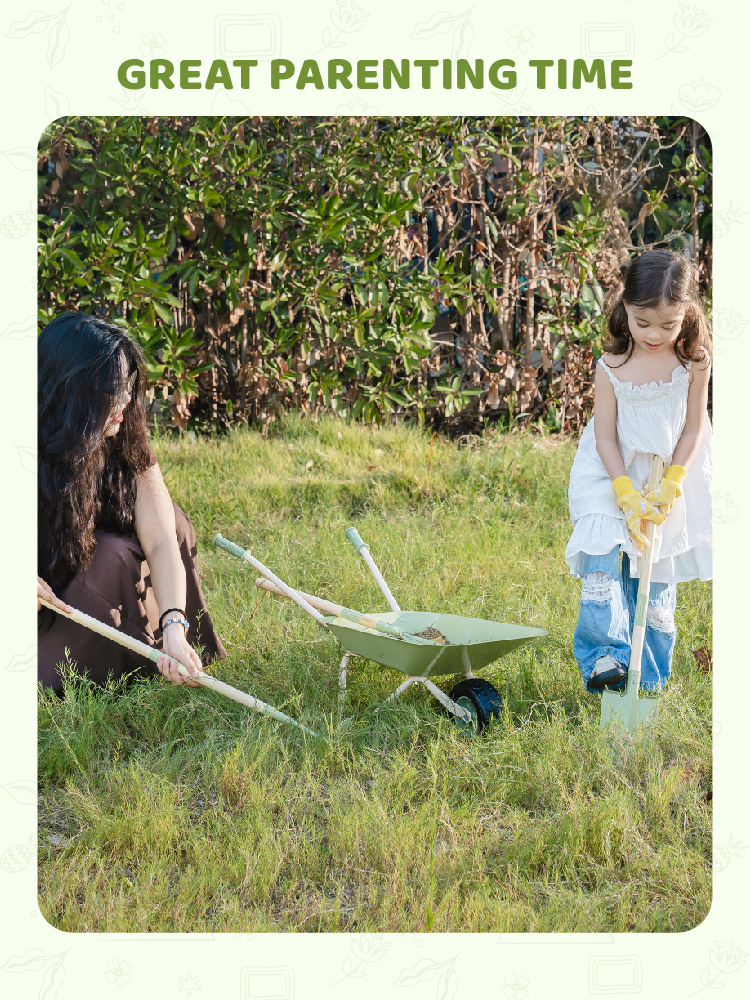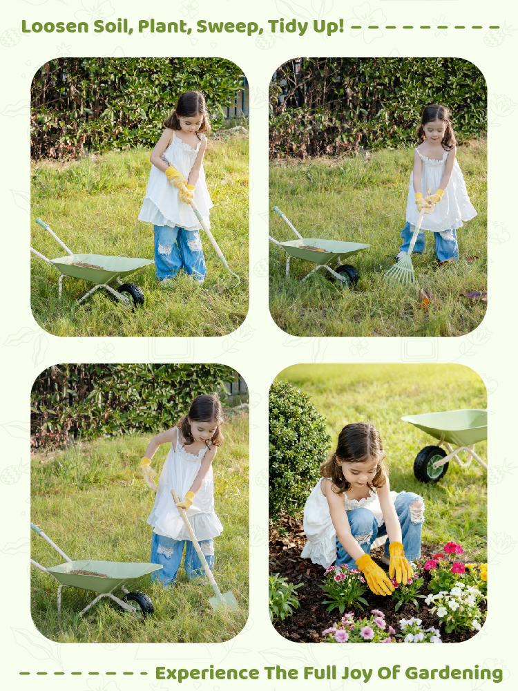 - Easy-to-Move Wheelbarrow Design--The lightweight, child-sized wheelbarrow allows kids to transport soil, leaves, or their favorite toys around the yard. Designed for stability and safety, it helps build balance, strength, and coordination while keeping playtime active and fun.