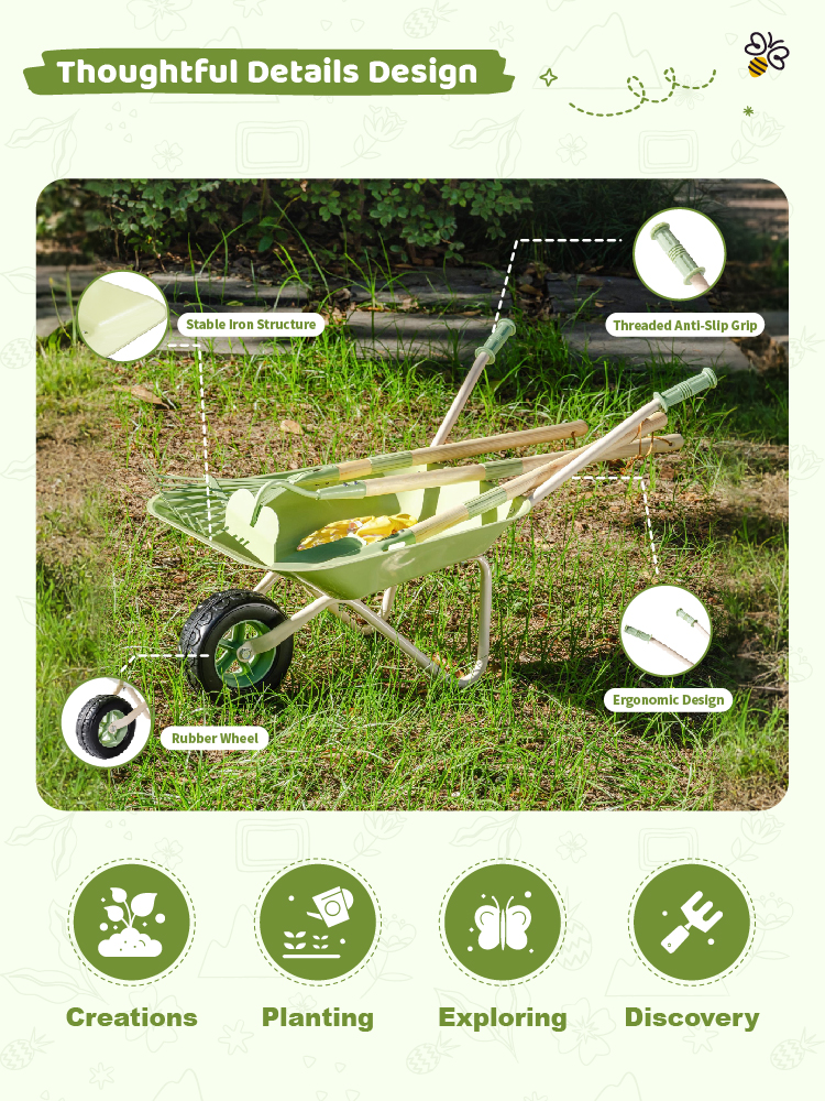 - Real Garden Fun for Little Explorers--This kids gardening set includes a sturdy wheelbarrow, 3 garden tools, a watering can, and 4 plant labels. Perfect for outdoor play, children can dig, plant, water, and label their “garden,” learning through imaginative hands-on activity.
