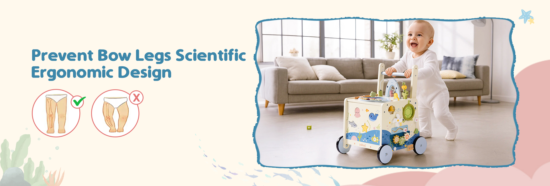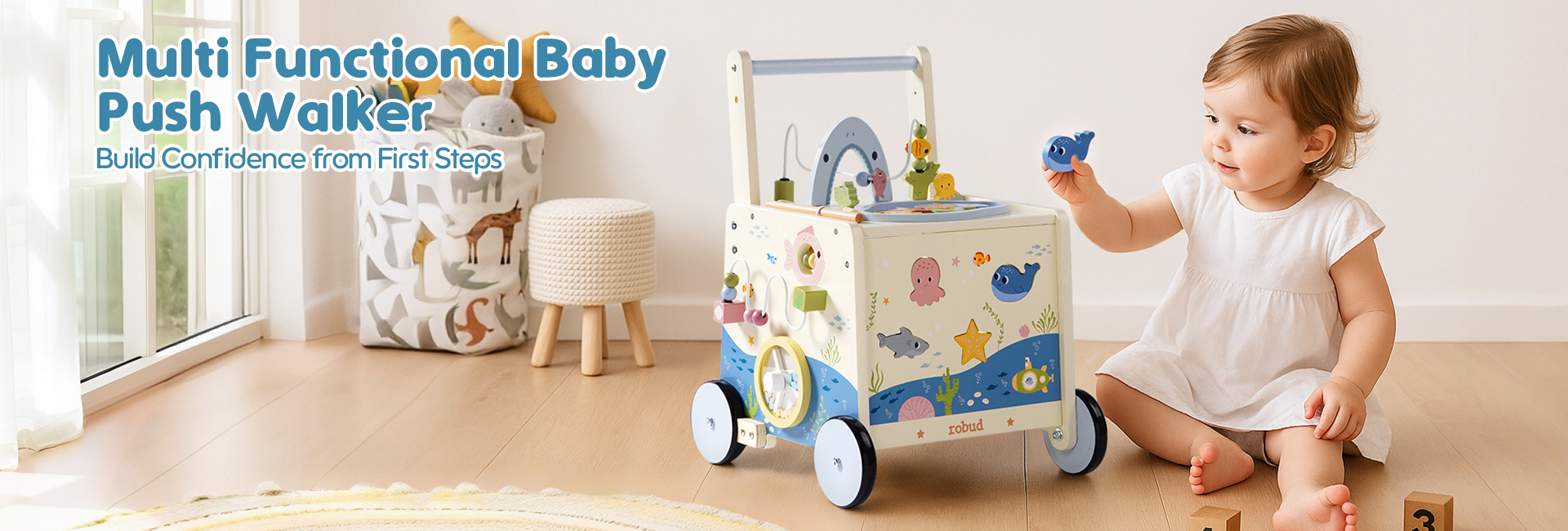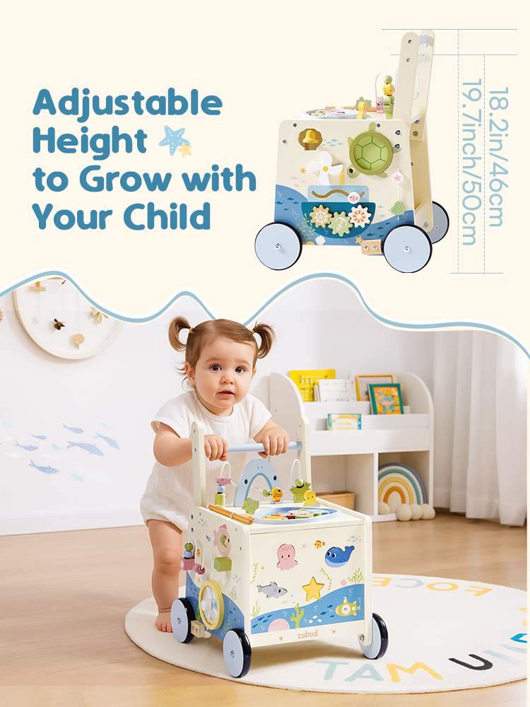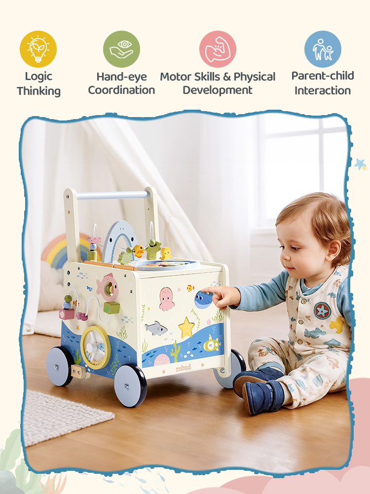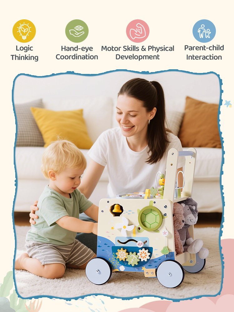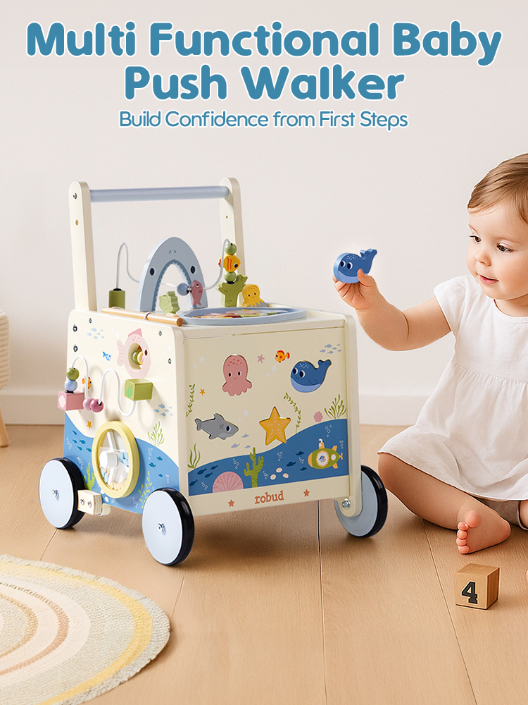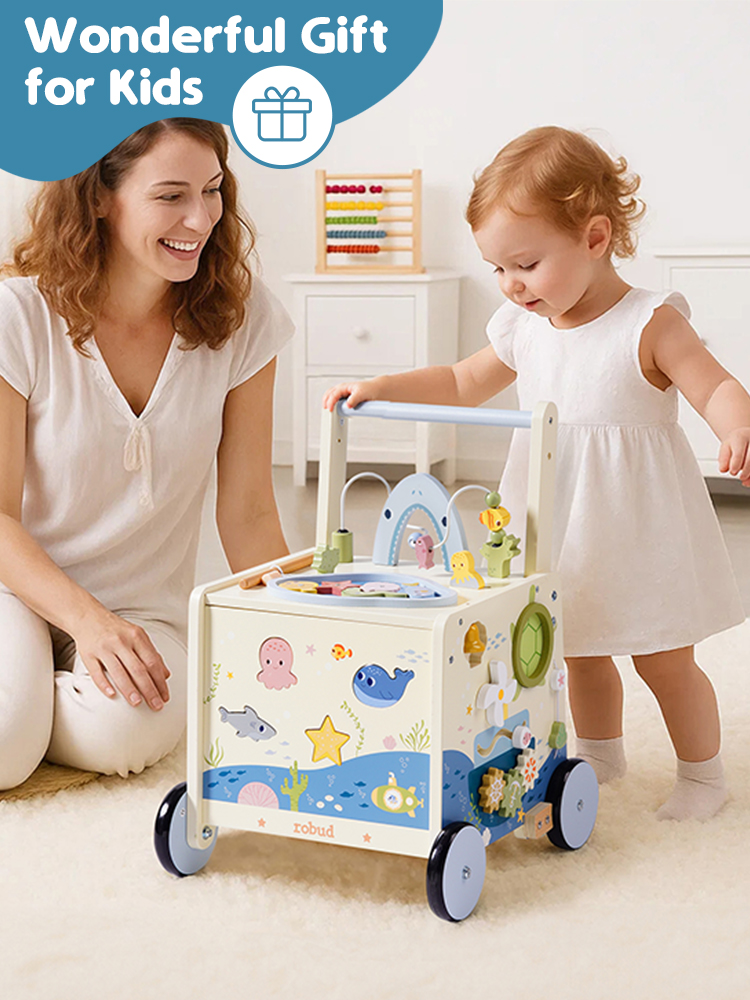 This wooden walker features a marine theme and integrates a variety of play functions, allowing children to engage in activities such as simulated sea fishing, shape matching, and salad sliders. These activities are inspired by Montessori education and are designed to develop a range of skills in children. It is also extremely stable, with a smooth, burr-free surface and rounded edges to prevent injuries. It is ideal for beginner walkers, helping babies stand and take their first steps, and developing essential stability and balance.