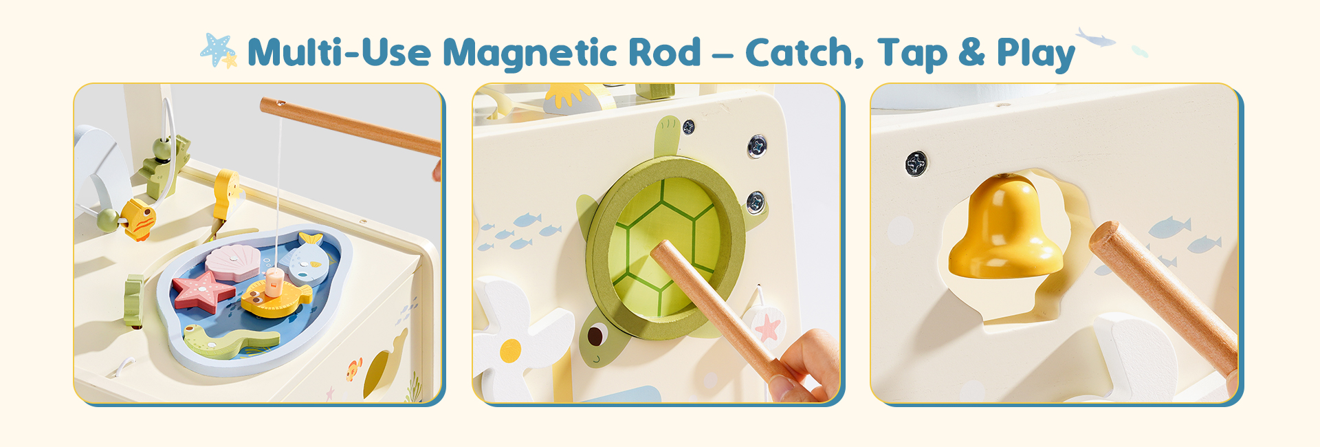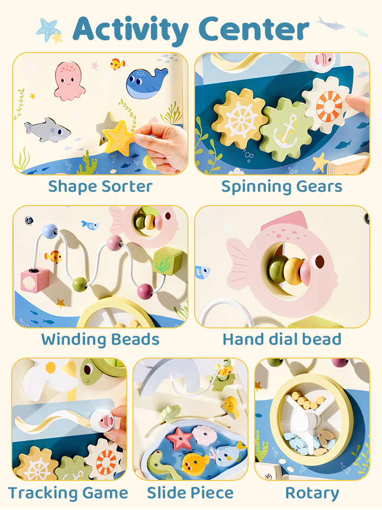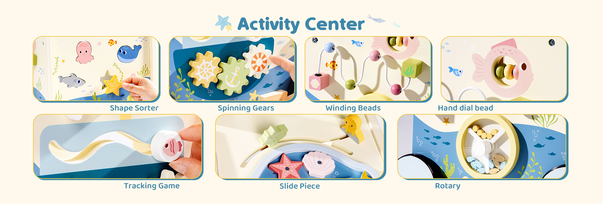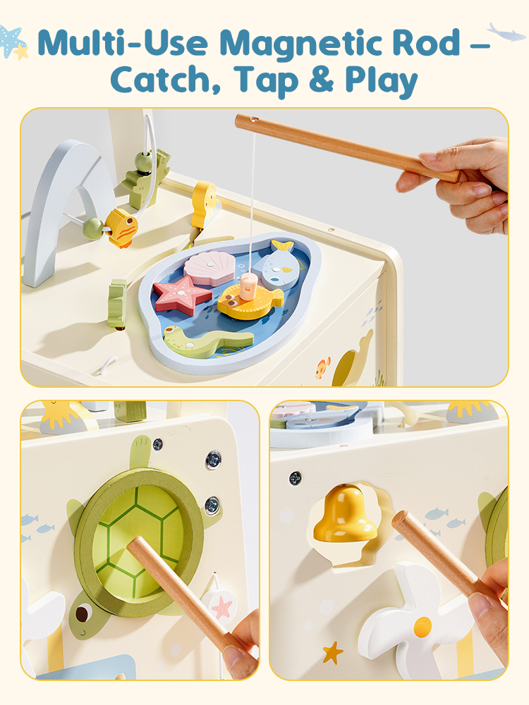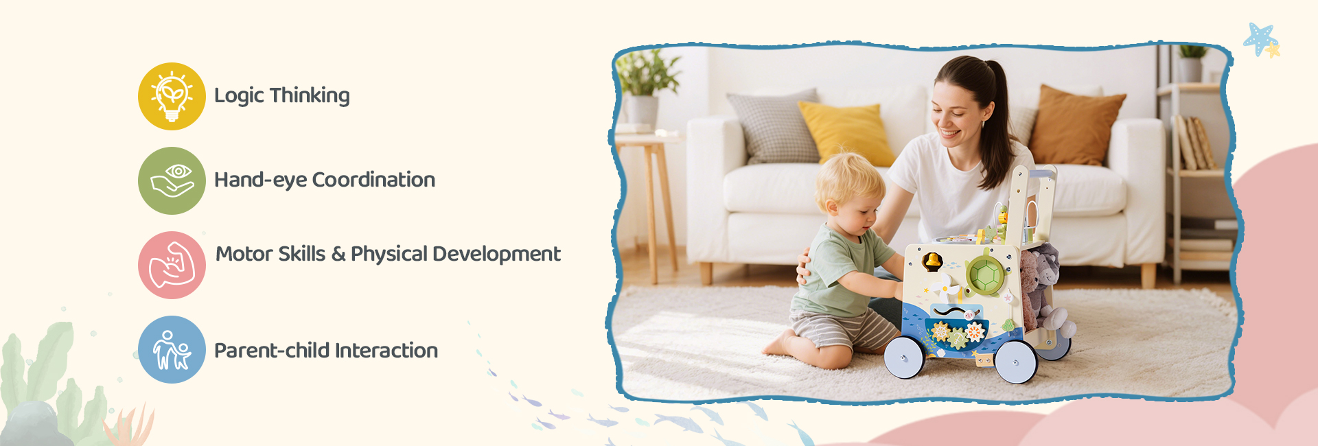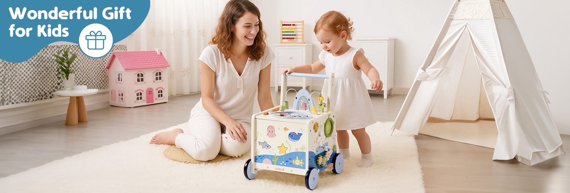 This wooden walker features a marine theme and integrates a variety of play functions, allowing children to engage in activities such as simulated sea fishing, shape matching, and salad sliders. These activities are inspired by Montessori education and are designed to develop a range of skills in children. It is also extremely stable, with a smooth, burr-free surface and rounded edges to prevent injuries. It is ideal for beginner walkers, helping babies stand and take their first steps, and developing essential stability and balance.