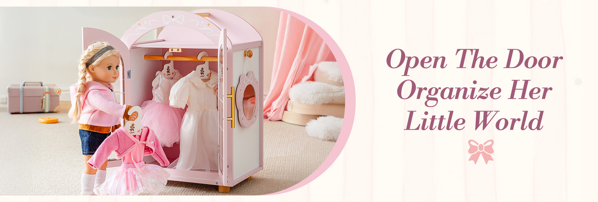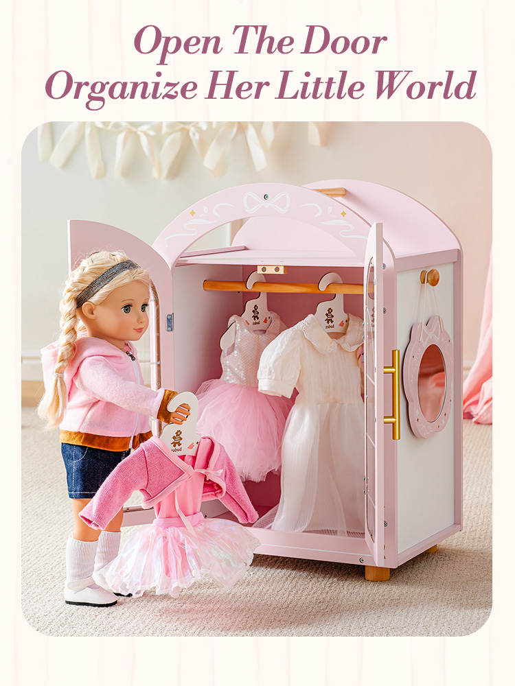 Let your little stylist’s dreams take flight with the Doll Wardrobe! The wardrobe blends a whimsical fairy arched design for 18 inch dolls. The elegant transparent doors let little ones show off their doll’s wardrobe at a glance, while the whimsical arched design adds a fairy-tale touch to any playroom.This isn’t just storage—it’s a catalyst for imagination! Kids will love playing “fashion stylist” as they pick out outfits, hang clothes, and fix their doll’s look in the mirror. Plus, it teaches little ones to keep their doll’s accessories tidy, while making cleanup feel like part of the fun. It’s ideal for 18-inch doll lovers who crave both style and order.