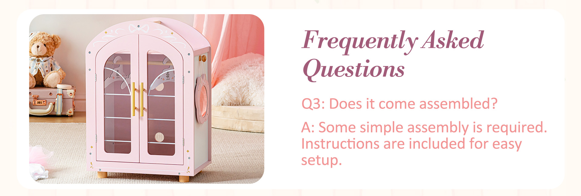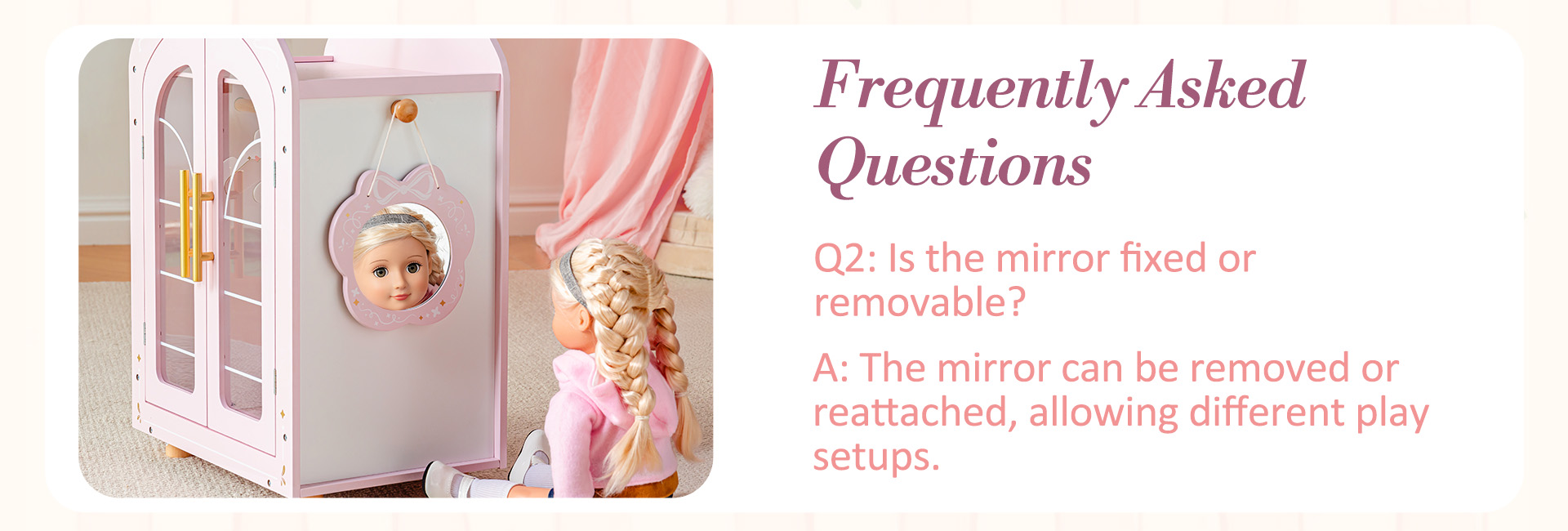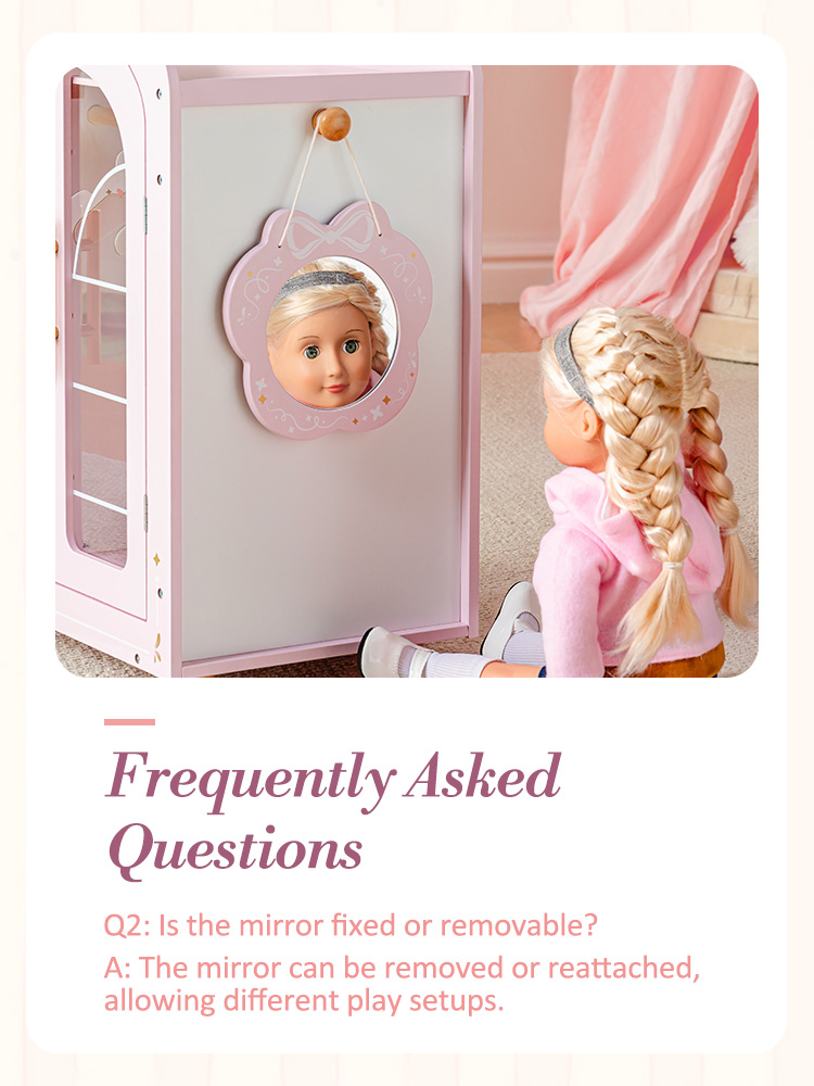 • 🪞 Dress-Up Fun with Movable Mirror: This doll closet is packed with playful features! The removable side mirror lets dolls “check their look” before heading out to imaginary tea parties. The top shelf is perfect for stashing tiny shoes and bags and other doll accessories, and the easy-grip handles make it a breeze for small hands to open and close.
