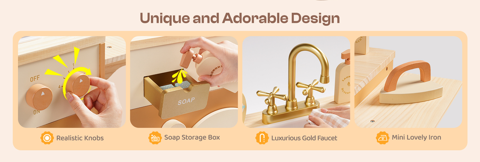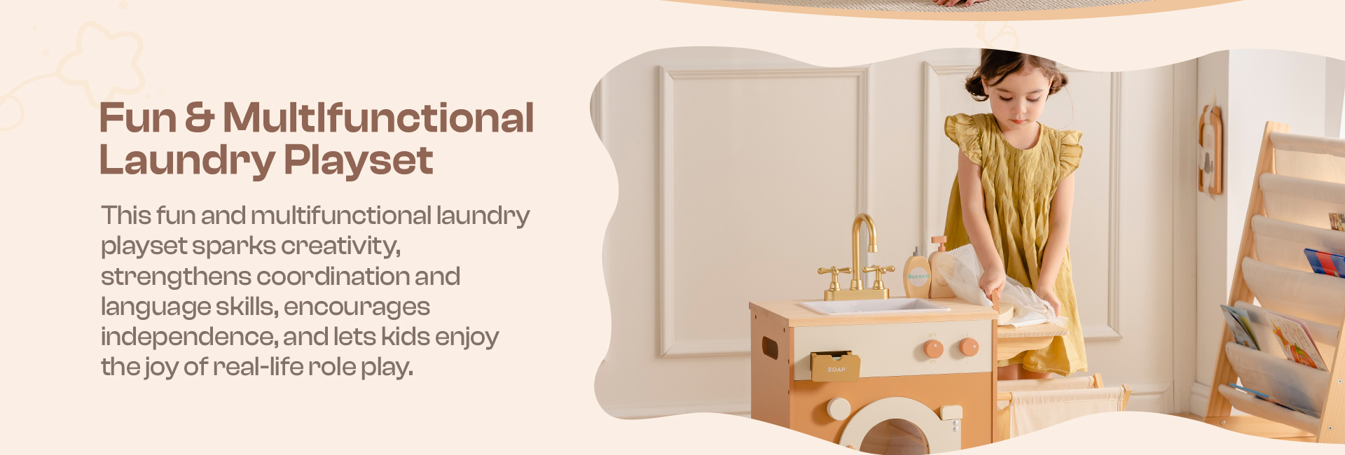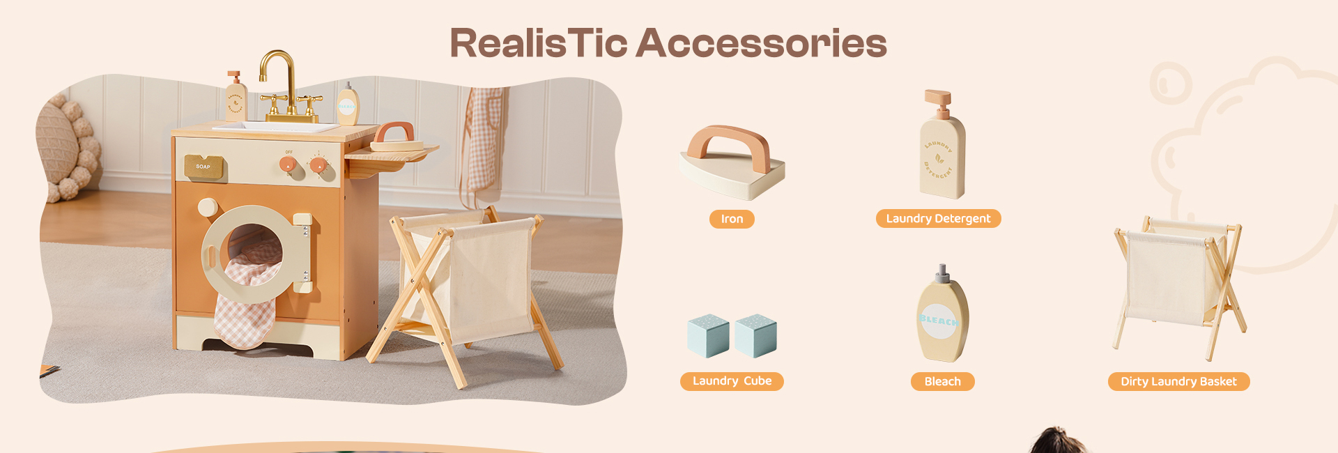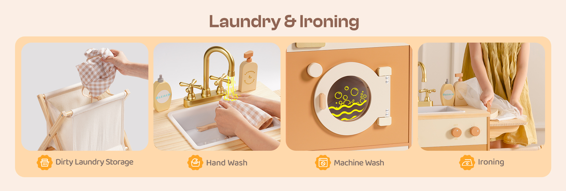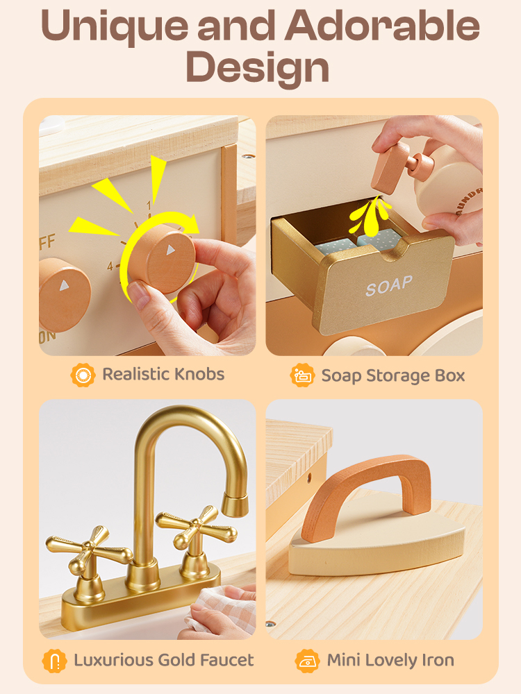 - 🐋REALISTIC DESIGN: This washing machine is crafted to simulate a real washing machine. Its cute appearance, along with the manually movable colorful beads on the washing machine window, mimics the rolling motion of a washing machine, visually captivating for children. It comes with a dirty clothes basket, soap, bleach, and laundry detergent, enhancing the gaming experience. Moreover, it features an ironing function, adding versatility to the washing machine.