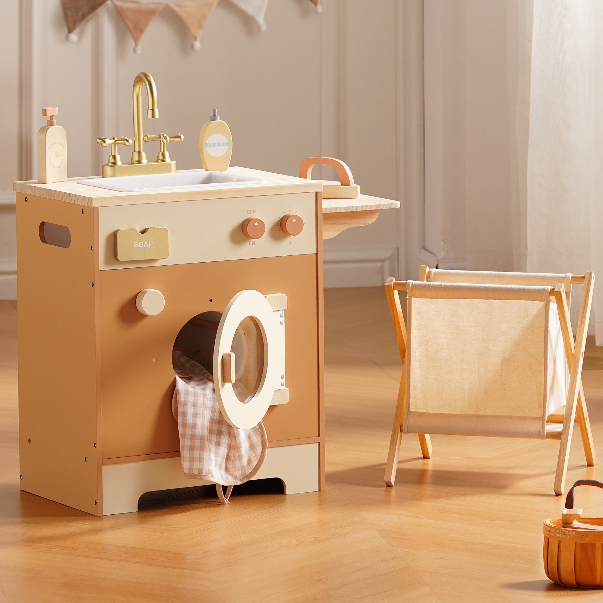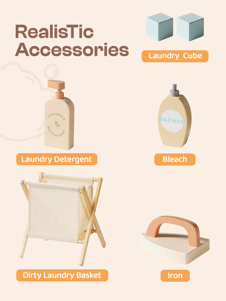 - 🌊ABUNDANT ACCESSORIES: This washing machine is designed with a variety of accessories to enhance the children's gaming experience. It includes laundry detergent, bleach, soap, and a soapbox. Additionally, it comes with an ironing board, iron, and a dirty clothes basket, providing all the accessories needed for daily washing activities. Get ready for children to embark on a laundry game adventure! (Excluding clothing)