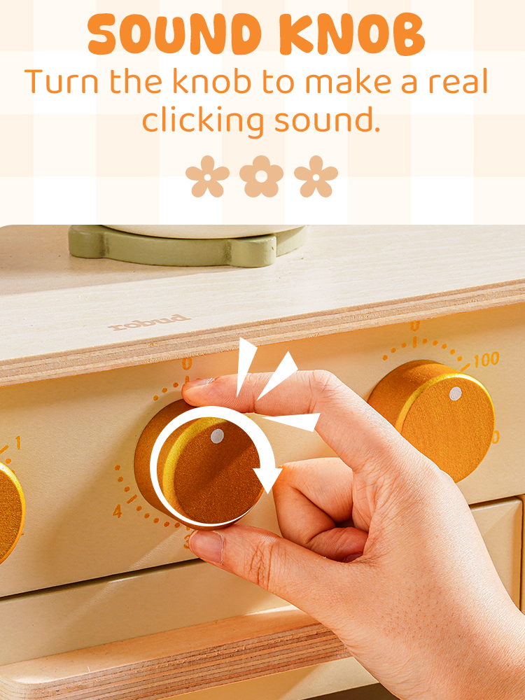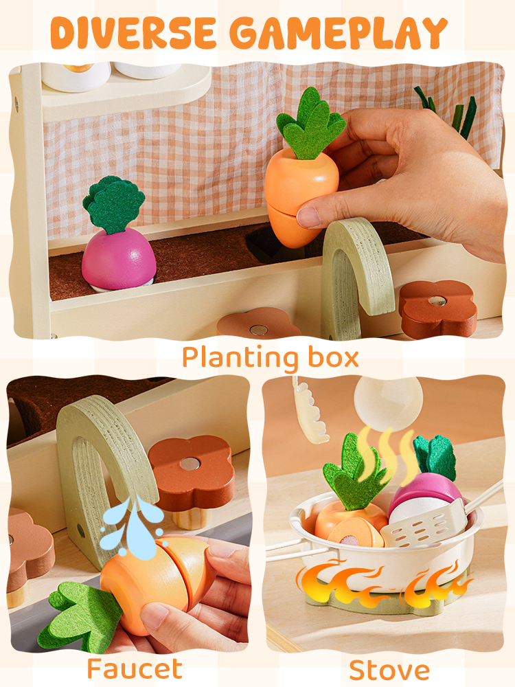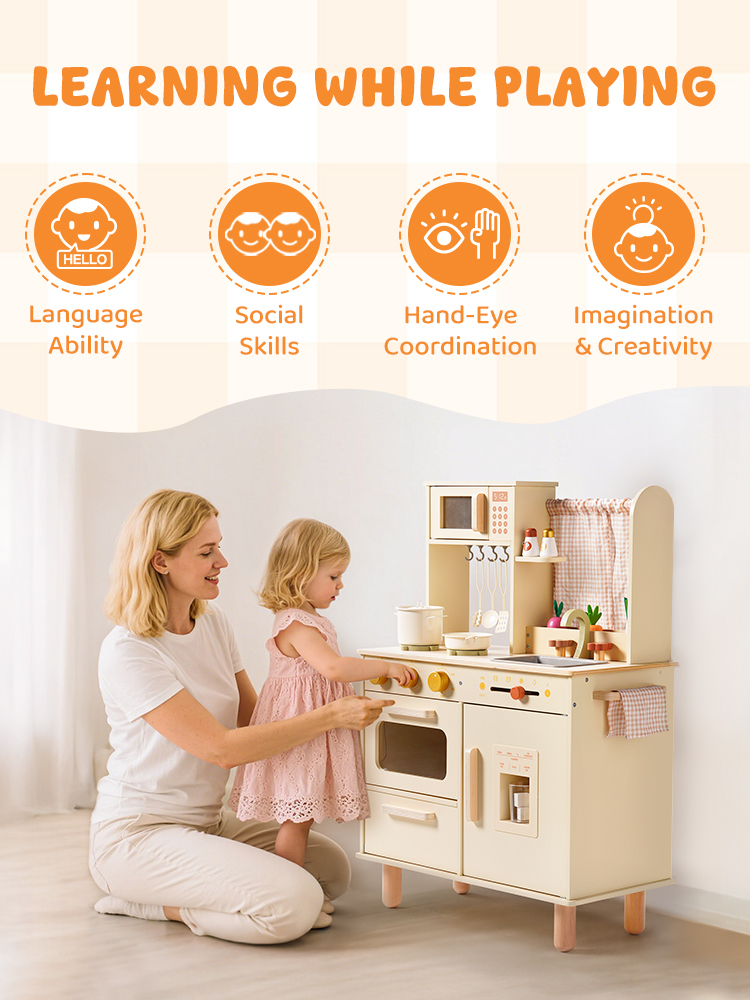 This wooden children's kitchen set includes a microwave, sink, stove, and ice maker. Every detail is meticulously designed to inspire children's imaginations, allowing them to simulate cooking, cleaning, and tidying up just like real adults. Ample storage space accommodates all the accessories, helping children develop tidying habits. The kitchen features sliding buttons, sound-activated knobs, hook shelves, and even a small blackboard, offering multiple ways to play. Children can use the included pots, pans, utensils, and simulated food to "cook," improving hand-eye coordination and fine motor skills. Available in charming green and cream colors, it complements cute checkered curtains and small vegetables, adding a bright touch to any playroom.