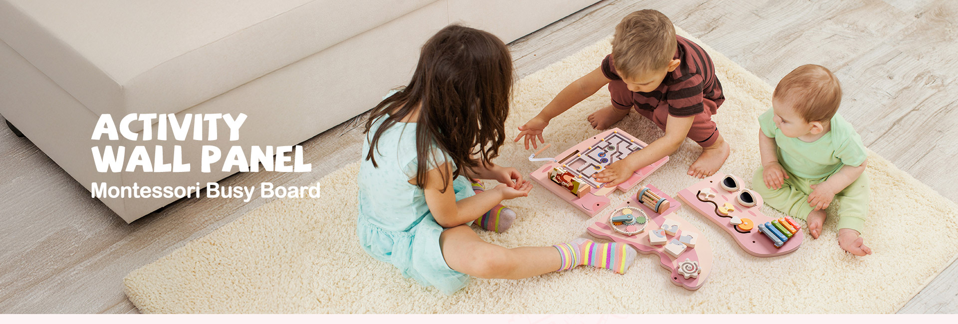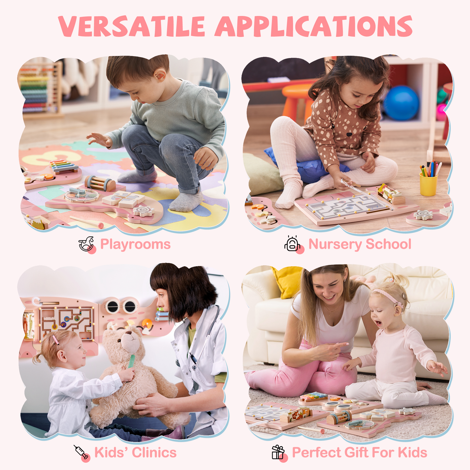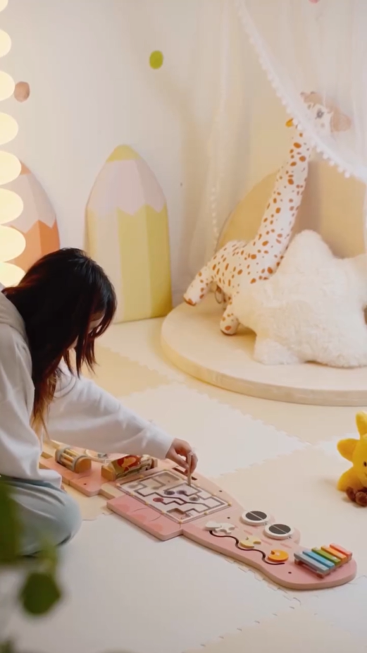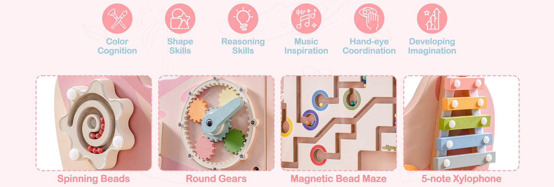 Interactive Wall-Mounted Busy Board - This versatile busy board features a variety of engaging activities, including a spinning bead maze, block matching, circular gears, magnetic bead maze, 5-note wooden xylophone and more. Each activity is designed to stimulate different aspects of a child's development, making it an ideal educational tool for any play area.